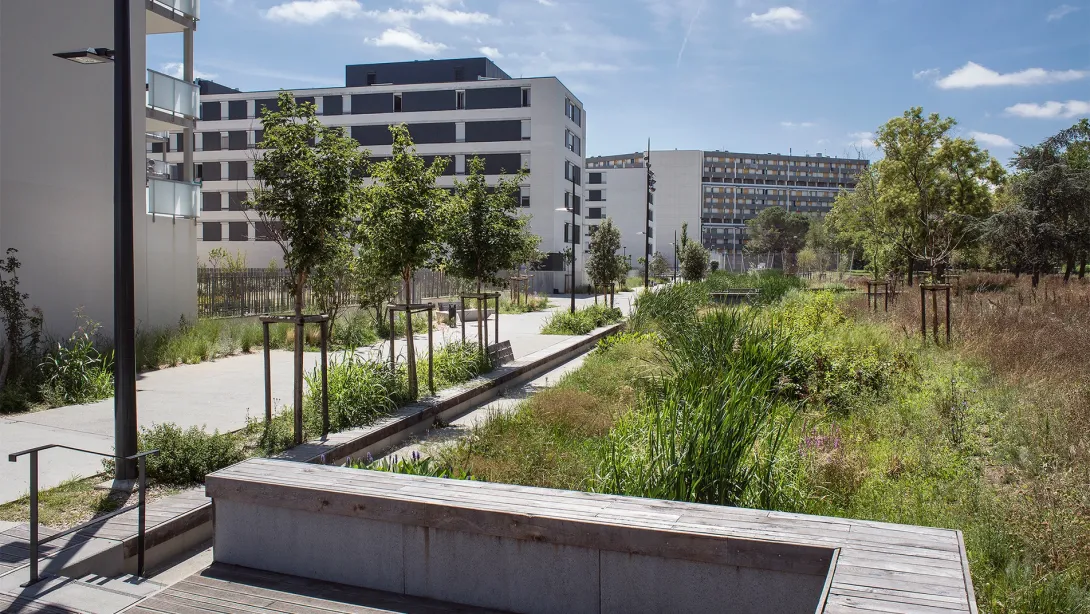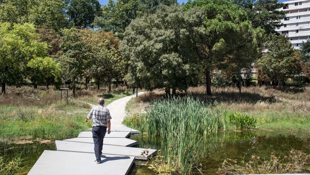 Un bassin à ciel ouvert a été créé pour la gestion des eaux de ruissellement du parc et les eaux de toitures des nouvelles opérations de logements. Ce bassin se connecte au réseau des bassins du quartier et alimente les grandes pièces d’eau du quartier. Les bassins existants de Candilis sont revalorisés et associés au réseau créé. Les nouveaux bassins ont une vocation esthétique et technique et l’eau est traitée en phytoépuration. Ils longent la promenade centrale et sont plantés par masses. Lors de fortes pluies, le bassin Sud permet de stocker les eaux. Une oxygénation des eaux est prévue grâce à la circulation de celles-ci à travers les différents bassins. Le long des cheminements des noues ont été mises en place pour récolter les eaux de surfaces et les faire cheminer à travers le parc vers le bassin paysager. Trois ans après la mise en service de ces aménagements, la prolifération de roseaux et de déchets dans le plan d’eau principal a été observée par les services gestionnaires questionnant la transformation de ces espaces en noues plantées.
