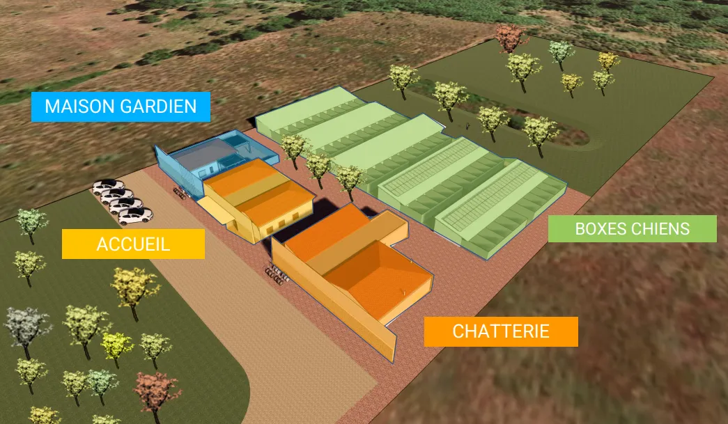• Usages : 1 bâtiment accueil, 1 logement gardien, 1 bâtiment chatterie, 50 boxes individuels pour chiens
