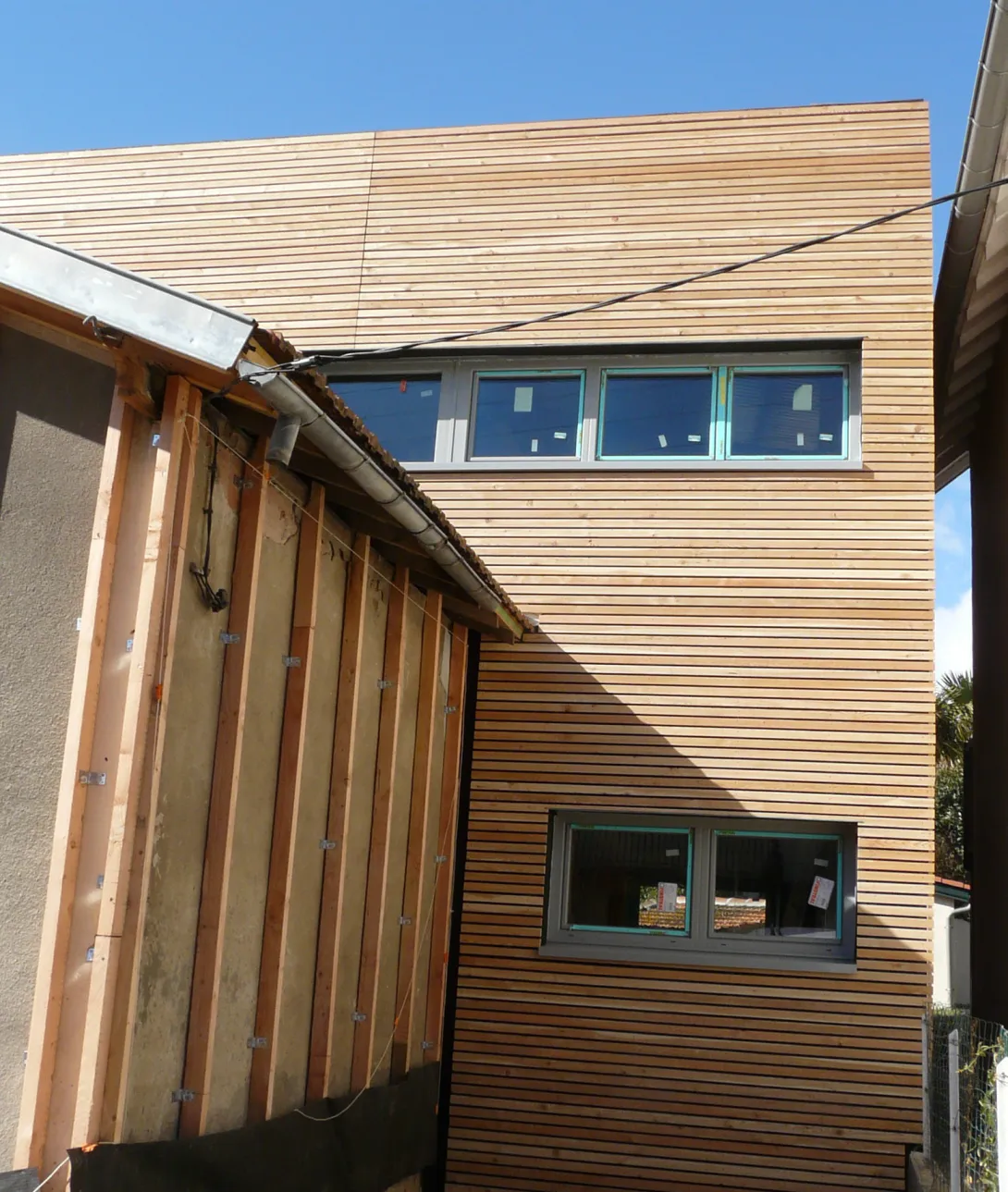 - Pour cela une extrême vigilance a été portée à l’isolation de la partie existante conservée et aux liaisons avec la partie en extension bois afin d’éviter tout ponts thermiques et toutes déperditions, ainsi qu’une bonne étanchéité à l’air.