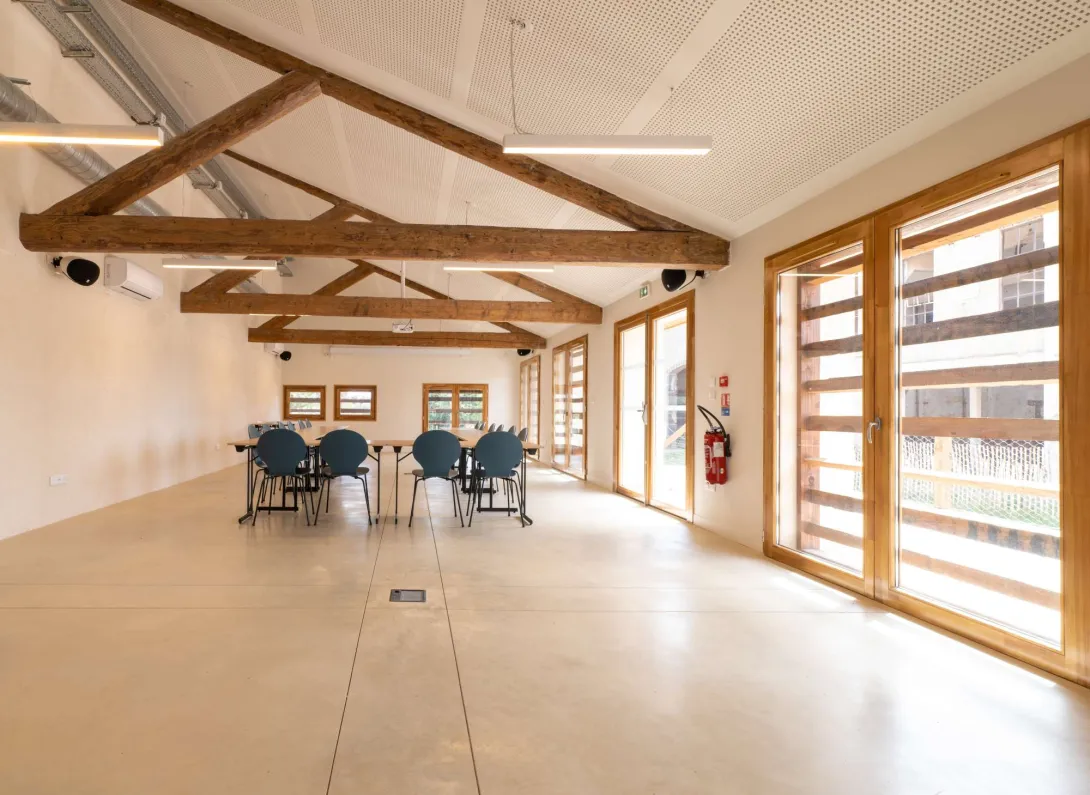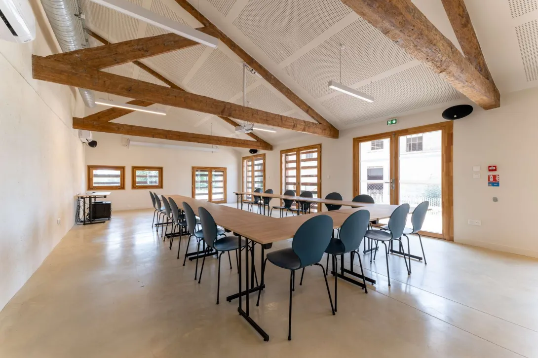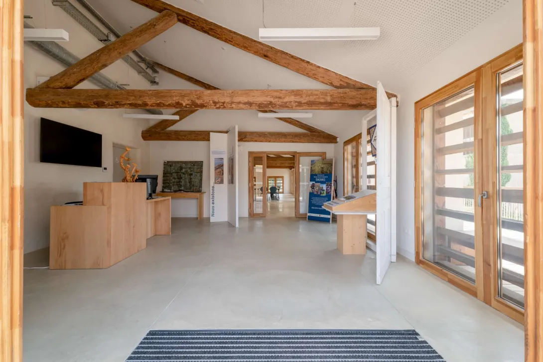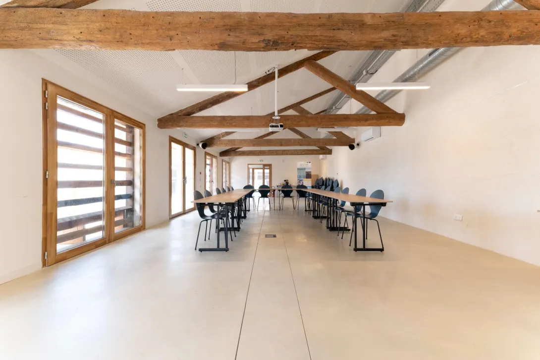 - Détournement d’usage pour les bois de la charpente existante : Bois réutilisé pour les brise-soleils et préservation et consolidation de la charpente existante