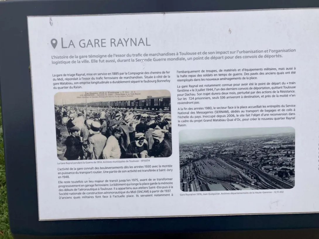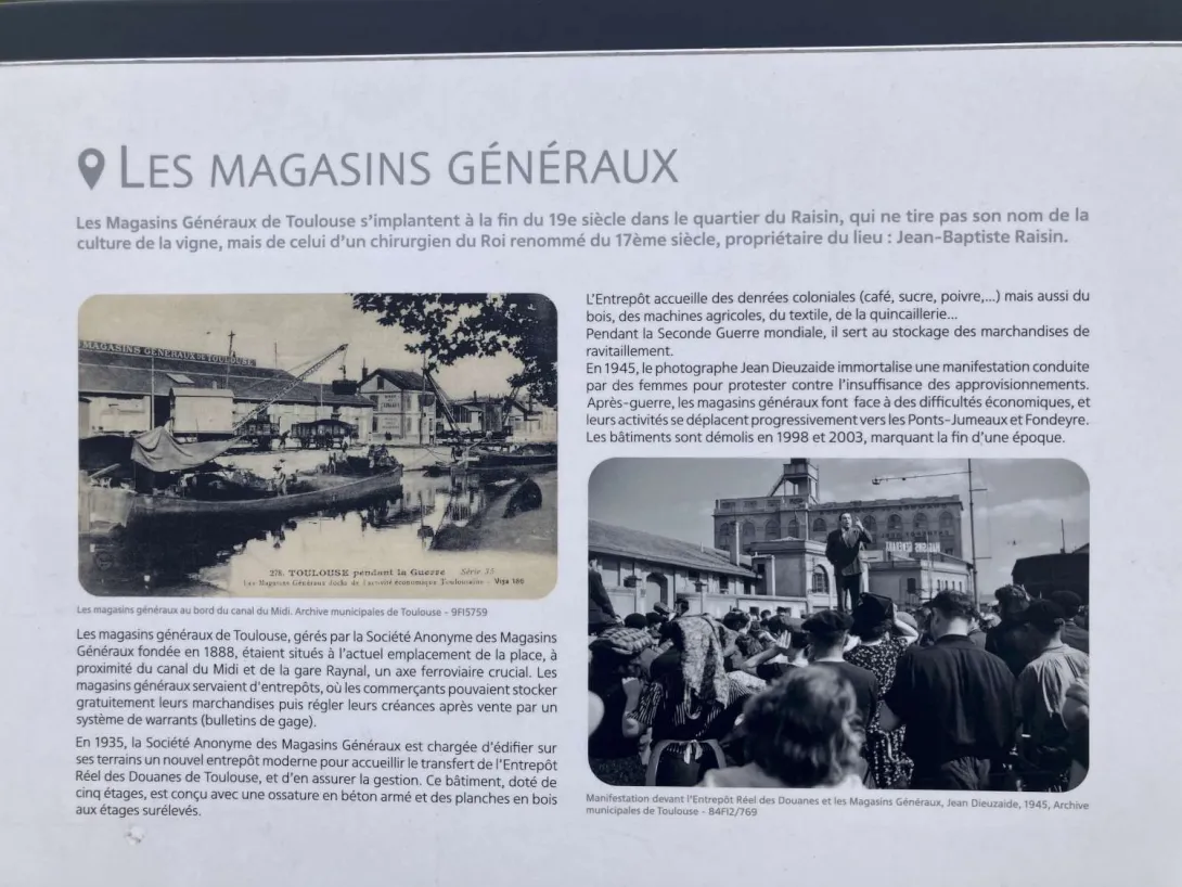 Enfin, des pupitres d’information historiques retracent la mémoire du site, notamment de la gare Raynal et des magasins généraux. Ils ont été réalisés par le bureau d’études L’usage des Lieux (LULI) en lien avec la direction du patrimoine de Toulouse. Les magasins généraux servaient à stocker les produits logistiques des commerçants de Toulouse en provenance du canal du Midi.