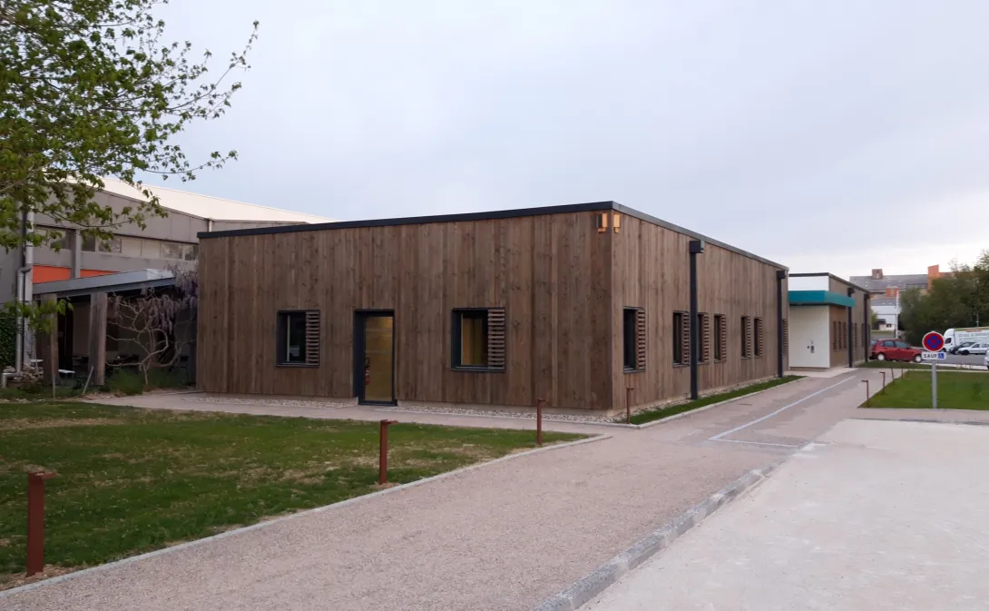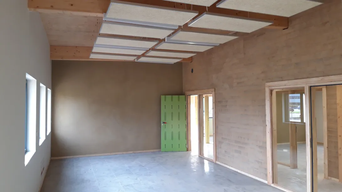 - Bureaux, espace pédagogique, locaux sociaux : ossature bois et isolation fibre de bois épaisseur 6 cm (panneaux) + 14,5 cm (insufflée), bardage extérieur bois (R = 5,9 m².K/W)
