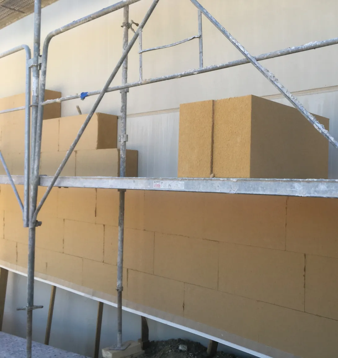 - Entrepôt : murs béton isolés par l’extérieur par 24 cm de fibre de bois sous enduit à la chaux (R = 6,4 m².K/W)