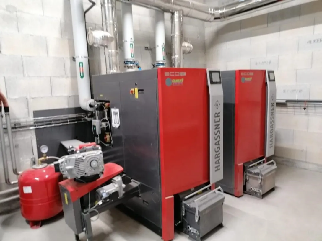 - Process (eau 50°C + ambiance) : chaudières bois 70 kW x 2, récupération sur groupe froid, ballon 4000 L ; réseau secondaire : batteries chaudes CTA, aérothermes