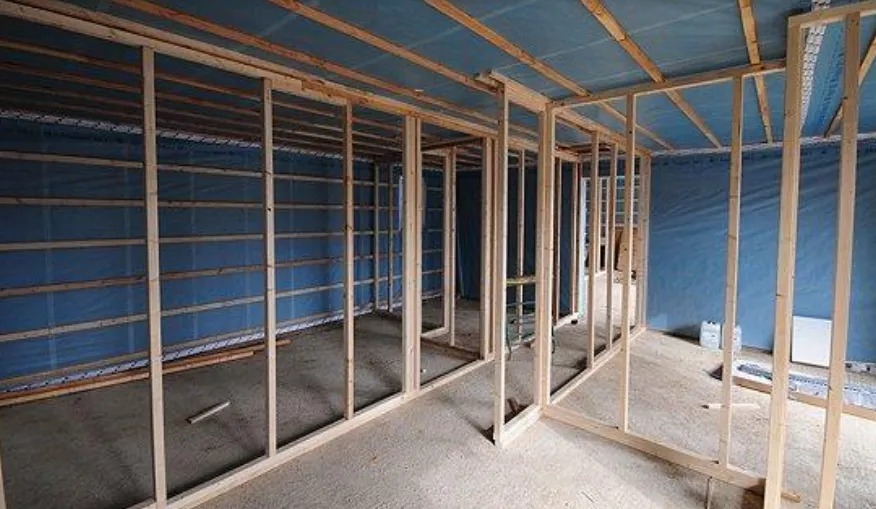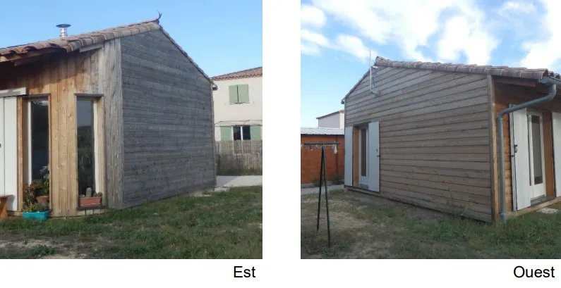 • Plâtre / pare vapeur / ossature bois avec isolation ouate de cellulose (15 cm) / pare pluie / bardage (R = 3,75 m².K/W)